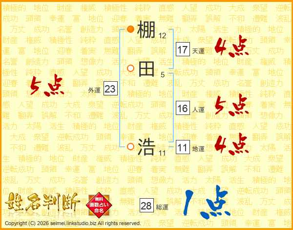 棚(12画)田(5画) 浩(11画)