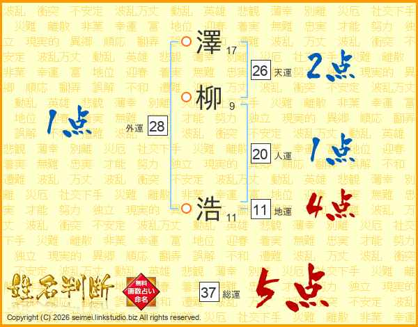 澤(17画)柳(9画) 浩(11画)