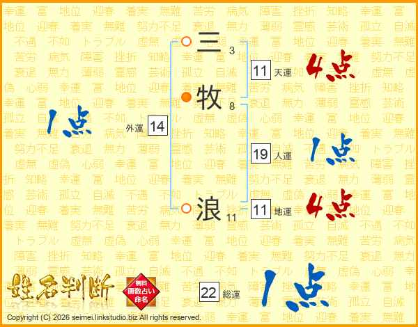 生活面を象徴する運勢です。外部から受ける影響力を表し、結婚運、家庭運や職場、環境への順応性を表します。総運から人運を引いた画数。姓や名が1文字の場合を除く。