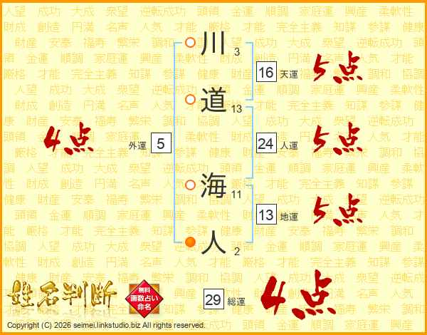 川道海人さんの総運は29画の4点!