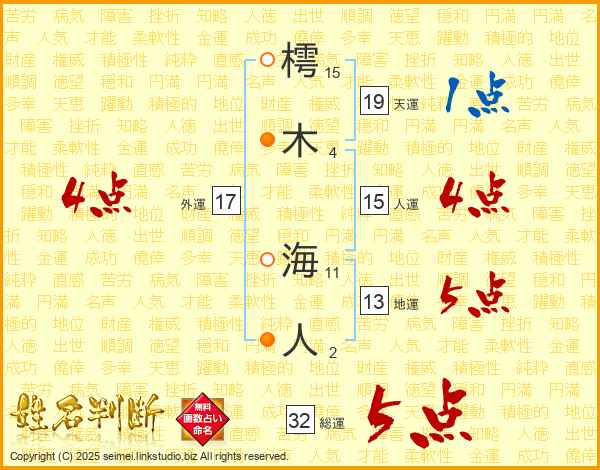 あなたの人生を表す1番重要な運勢です。生涯を通じて影響する総合運となり、主に50歳以降の晩年期に影響を及ぼします。苗字と名前の合計画数。