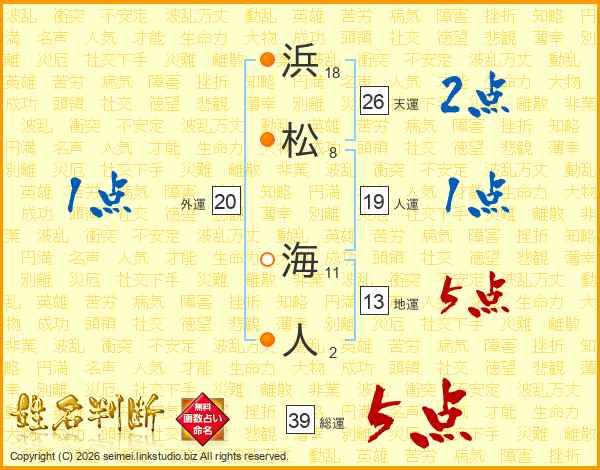 あなたの人生を表す1番重要な運勢です。生涯を通じて影響する総合運となり、主に50歳以降の晩年期に影響を及ぼします。苗字と名前の合計画数。