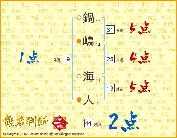 鍋(17画)嶋(14画) 海(11画)人(2画)