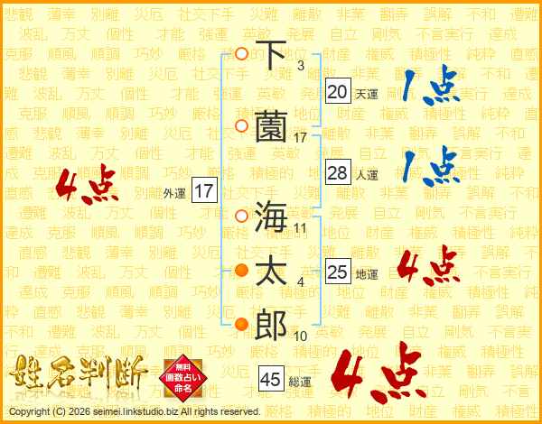 下(3画)薗(17画) 海(11画)太(4画)郎(10画)