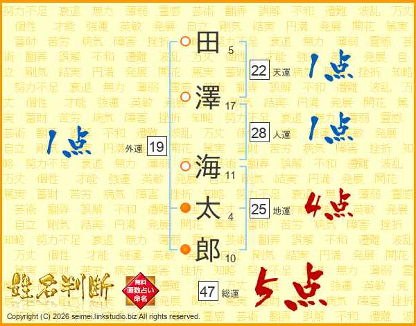 田(5画)澤(17画) 海(11画)太(4画)郎(10画)