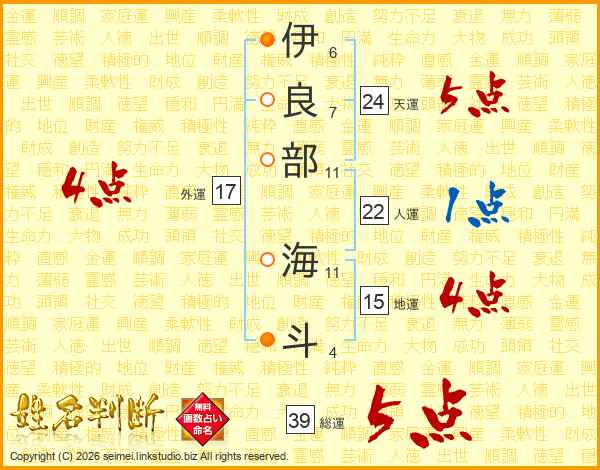 伊(6画)良(7画)部(11画) 海(11画)斗(4画)