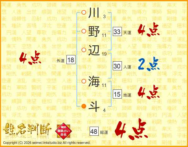 川(3画)野(11画)辺(19画) 海(11画)斗(4画)