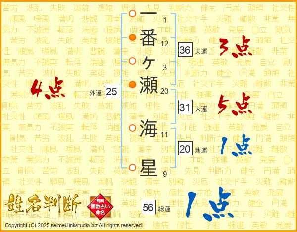 一番ヶ瀬海星さんの総運は56画の1点!