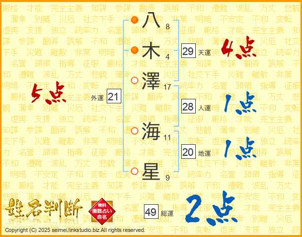 八(8画)木(4画)澤(17画) 海(11画)星(9画)