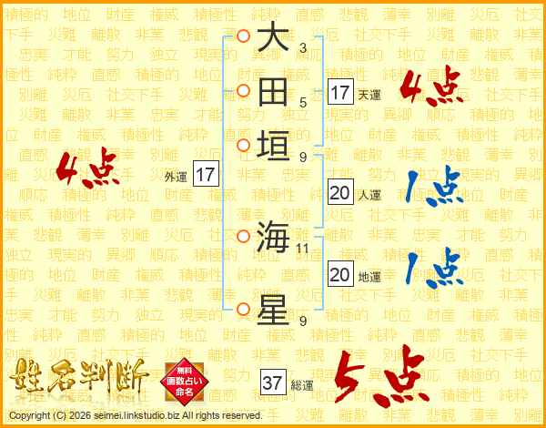 大(3画)田(5画)垣(9画) 海(11画)星(9画)