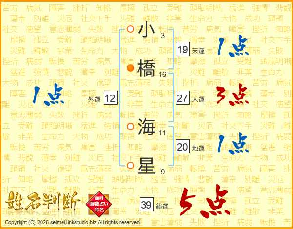あなたの人生を表す1番重要な運勢です。生涯を通じて影響する総合運となり、主に50歳以降の晩年期に影響を及ぼします。苗字と名前の合計画数。