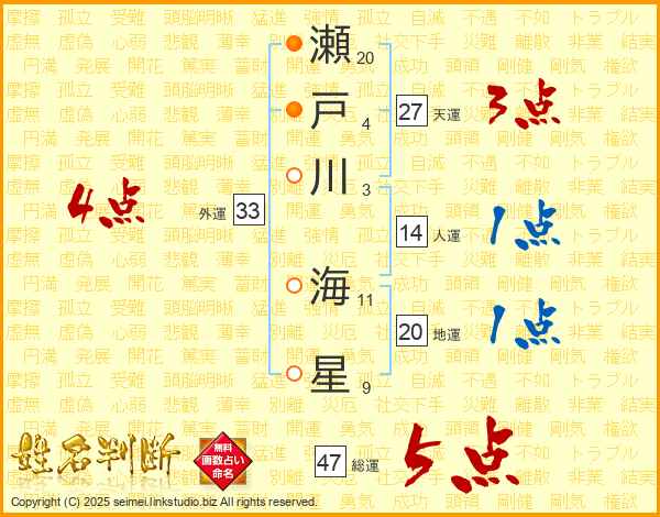 瀬(20画)戸(4画)川(3画) 海(11画)星(9画)