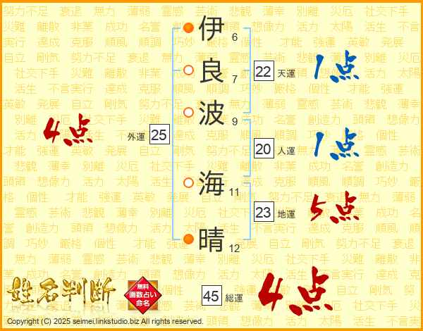 伊(6画)良(7画)波(9画) 海(11画)晴(12画)