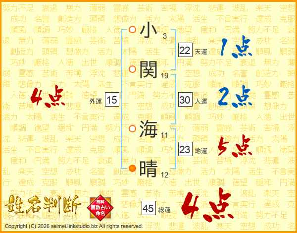 小関海晴さんの総運は45画の4点!