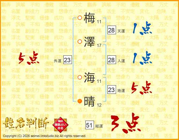 梅(11画)澤(17画) 海(11画)晴(12画)