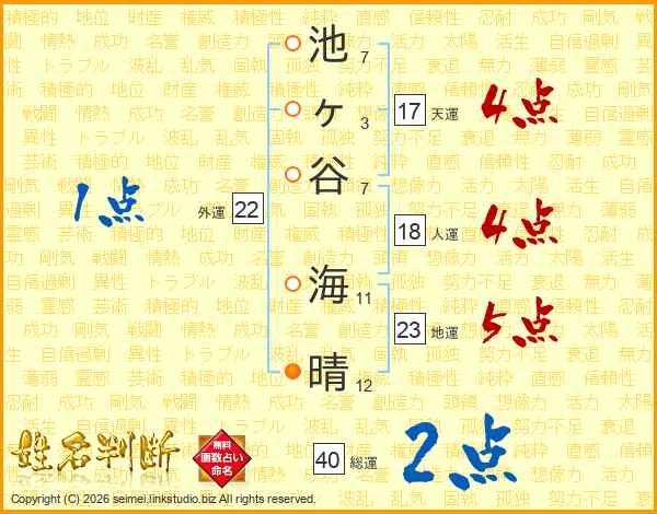 池(7画)ヶ(3画)谷(7画) 海(11画)晴(12画)