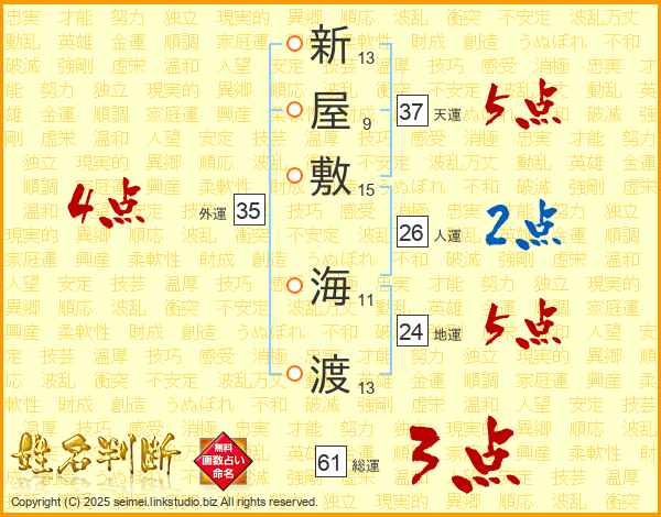 新屋敷海渡さんの天運は37画の5点!