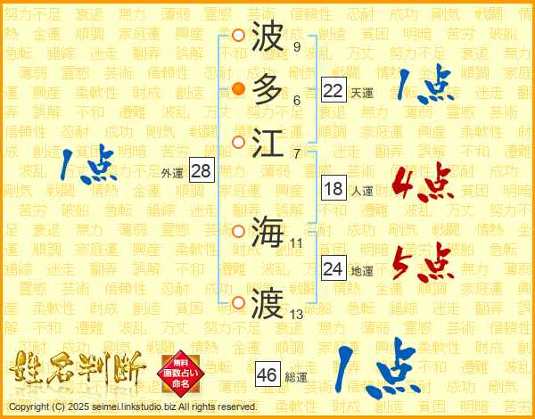 波(9画)多(6画)江(7画) 海(11画)渡(13画)