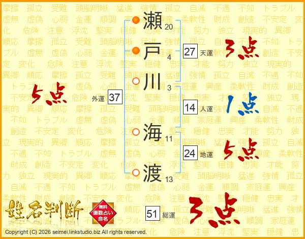 瀬戸川海渡さんの天運は27画の3点!