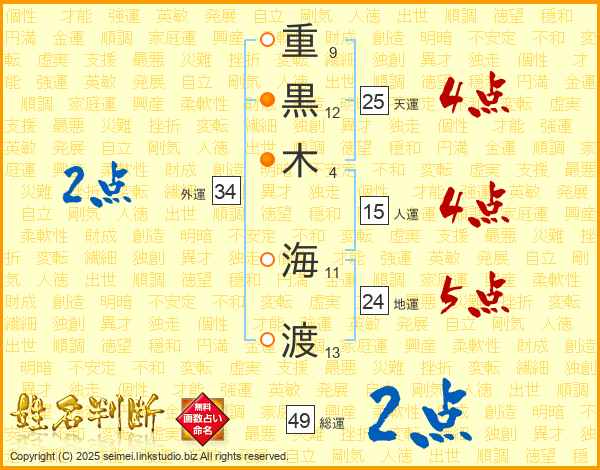 重(9画)黒(12画)木(4画) 海(11画)渡(13画)