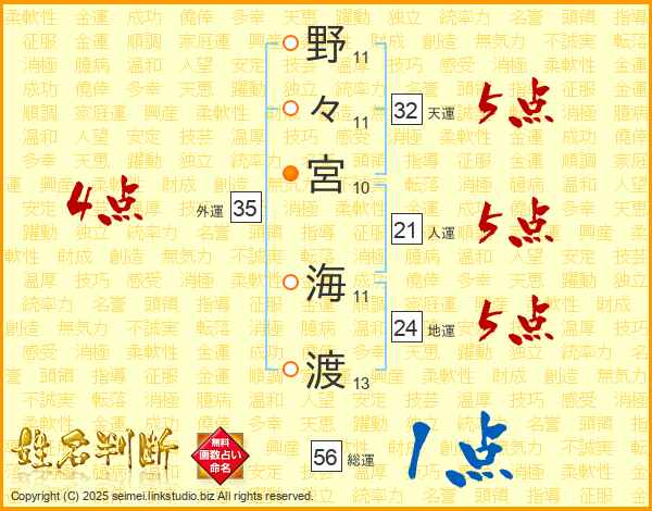 野(11画)々(11画)宮(10画) 海(11画)渡(13画)