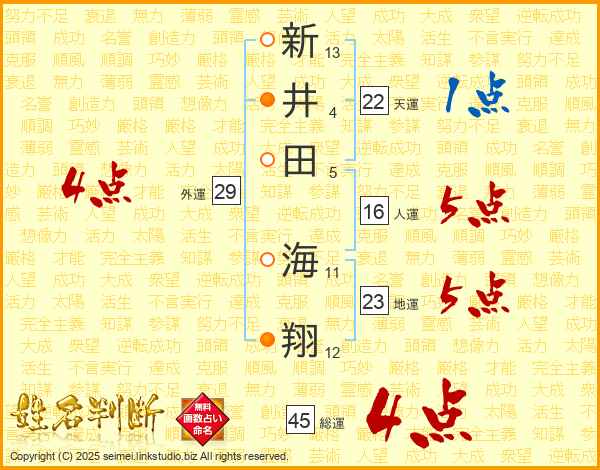 新(13画)井(4画)田(5画) 海(11画)翔(12画)