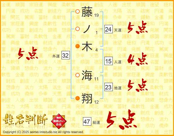 藤(19画)ノ(1画)木(4画) 海(11画)翔(12画)