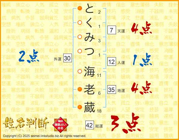 と(2画)く(1画)み(3画)つ(1画) 海(11画)老(6画)蔵(18画)