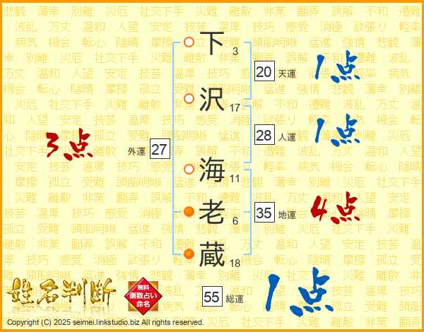 下(3画)沢(17画) 海(11画)老(6画)蔵(18画)