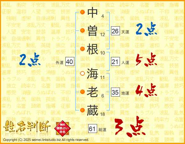 中(4画)曽(12画)根(10画) 海(11画)老(6画)蔵(18画)