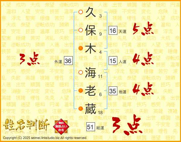 久(3画)保(9画)木(4画) 海(11画)老(6画)蔵(18画)