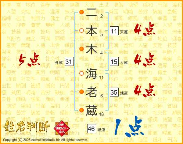生活面を象徴する運勢です。外部から受ける影響力を表し、結婚運、家庭運や職場、環境への順応性を表します。総運から人運を引いた画数。姓や名が1文字の場合を除く。