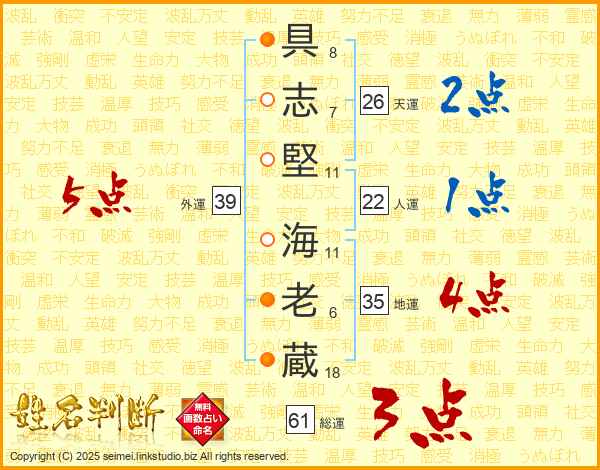 具(8画)志(7画)堅(11画) 海(11画)老(6画)蔵(18画)