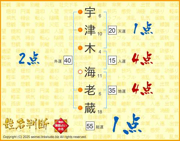 宇(6画)津(10画)木(4画) 海(11画)老(6画)蔵(18画)
