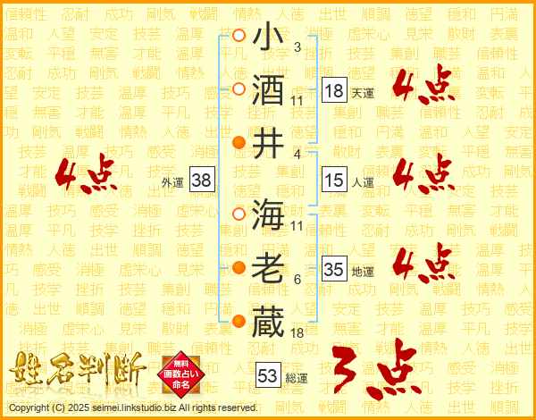 小(3画)酒(11画)井(4画) 海(11画)老(6画)蔵(18画)
