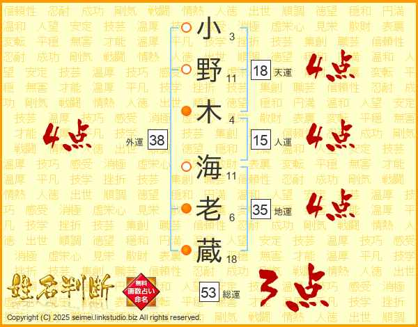 小(3画)野(11画)木(4画) 海(11画)老(6画)蔵(18画)