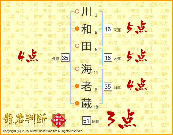 川(3画)和(8画)田(5画) 海(11画)老(6画)蔵(18画)