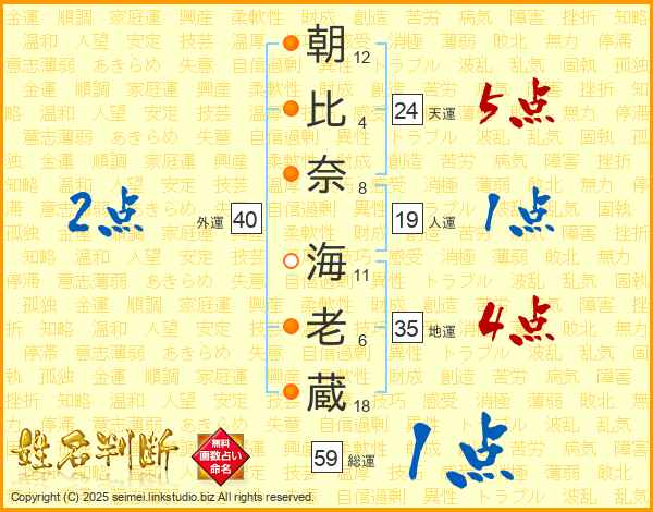 朝(12画)比(4画)奈(8画) 海(11画)老(6画)蔵(18画)