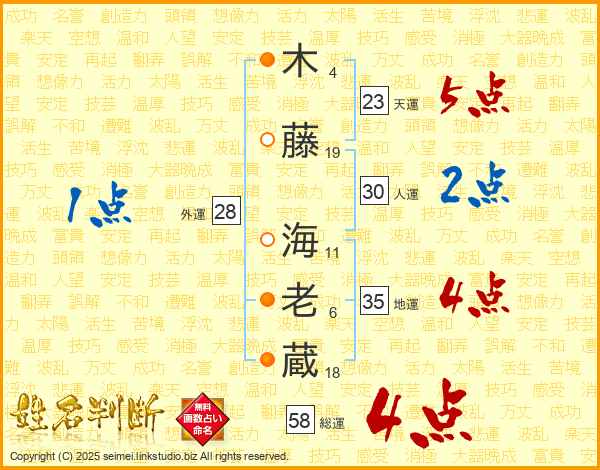 木(4画)藤(19画) 海(11画)老(6画)蔵(18画)