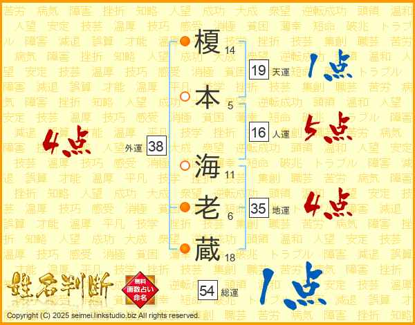 榎(14画)本(5画) 海(11画)老(6画)蔵(18画)