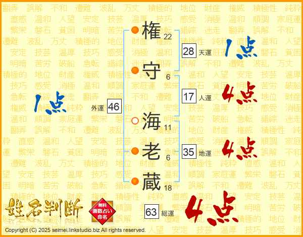 権(22画)守(6画) 海(11画)老(6画)蔵(18画)