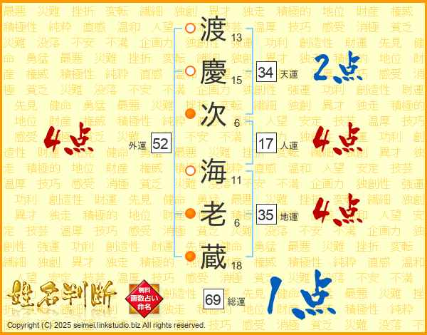 渡(13画)慶(15画)次(6画) 海(11画)老(6画)蔵(18画)