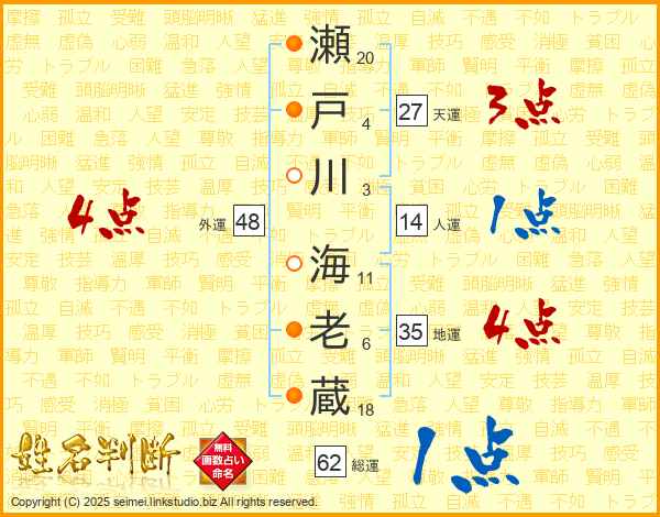 生活面を象徴する運勢です。外部から受ける影響力を表し、結婚運、家庭運や職場、環境への順応性を表します。総運から人運を引いた画数。姓や名が1文字の場合を除く。