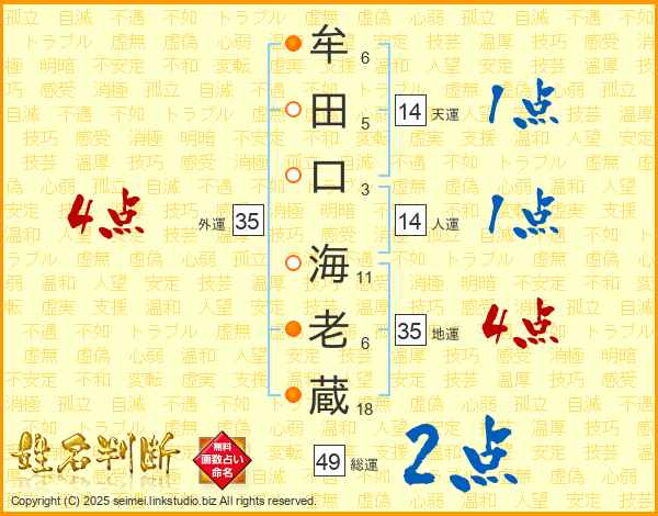 牟(6画)田(5画)口(3画) 海(11画)老(6画)蔵(18画)