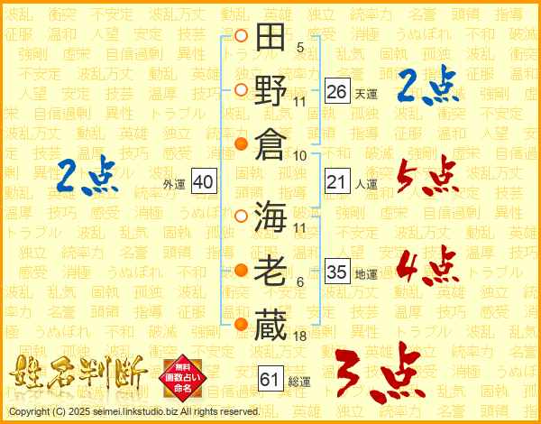 田(5画)野(11画)倉(10画) 海(11画)老(6画)蔵(18画)