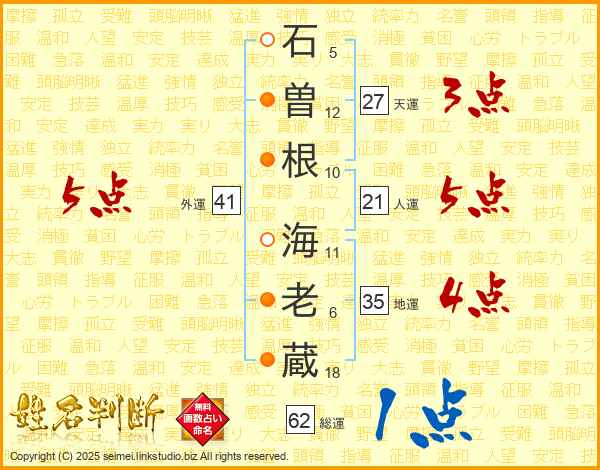 石(5画)曽(12画)根(10画) 海(11画)老(6画)蔵(18画)