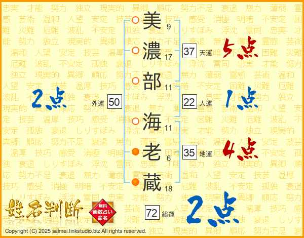 美(9画)濃(17画)部(11画) 海(11画)老(6画)蔵(18画)