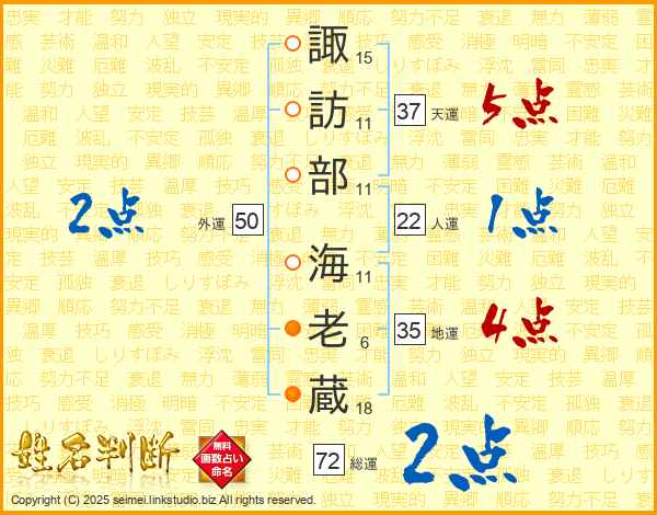 諏(15画)訪(11画)部(11画) 海(11画)老(6画)蔵(18画)