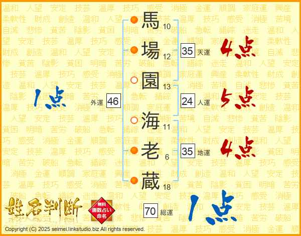 馬(10画)場(12画)園(13画) 海(11画)老(6画)蔵(18画)