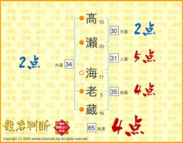 髙(10画)瀨(20画) 海(11画)老(6画)蔵(18画)